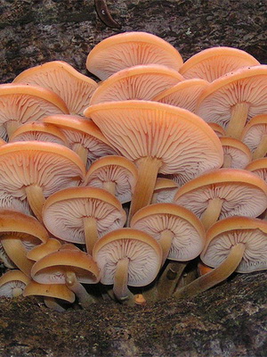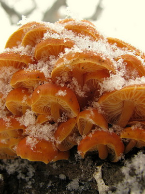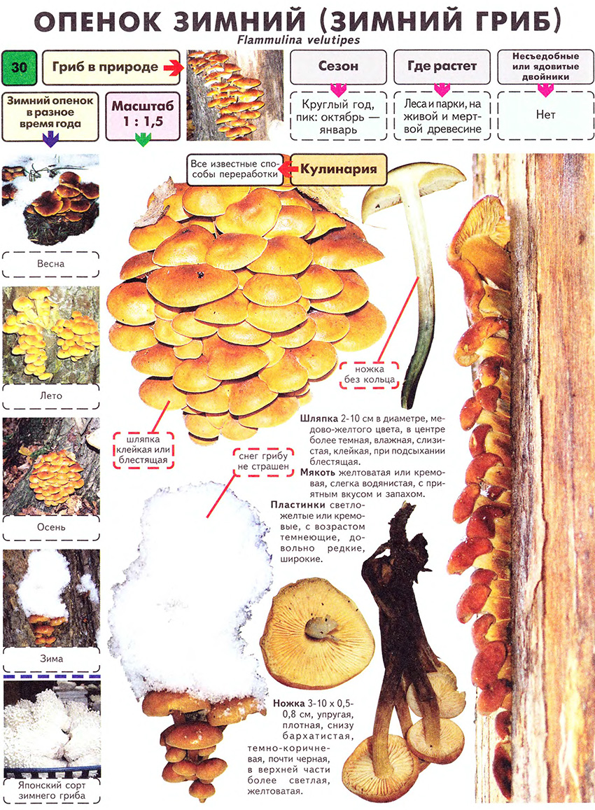 Как видно на фото, фламмулина имеет пластинки, слегка приросшие к ножке или свободные, белые до светло-охряных, с характерными маленькими перемычками. У молодых грибов пластинки светло-желтые или кремовые, у старых — темнеющие, довольно редкие, широкие. Мякоть шляпки довольно толстая, желтоватая или кремовая, с мягким вкусом и приятным грибным запахом. Ножка 5-10 X 0,3-1 см, цилиндрическая, сверху иногда уплощенная, упругая, плотная, обычно центральная, с возрастом изогнутая, в основании темно-коричневая и бархатистая, сверху более светлая, желтоватая. Зимний гриб может появиться везде, где есть ослабленные деревья и кустарники. Ему почти безразлично, где расти — в лесу, парке, саду или вообще на городских улицах. Как и его близкий родственник, осенний опенок, гриб паразитирует на живых лиственных и (реже) хвойных деревьях, нередко вызывая их усыхание и гибель. Шляпки зимнего опенка, образующие тесно скученные группы на пнях, стволах и ветвях деревьев, зимой замерзают и становятся очень хрупкими, словно стеклянными; но как только наступает временная оттепель, они немедленно оживают, и на пластинках у них образуются способные к прорастанию споры.