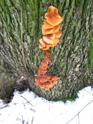 Время плодоношения зимнего опенка — один из ярких примеров результата действия этой конкуренции. Почти все наши лесные древесные грибы распространяются посредством спор. Ветер, дождь, птицы и насекомые разносят их, и, попав в благоприятные условия (в нашем случае — на поврежденные участки коры, ветвей, стволов и корней), споры прорастают, давая начало новому грибному организму. Все это происходит в летне-осеннее время.