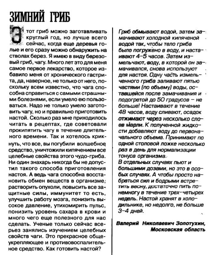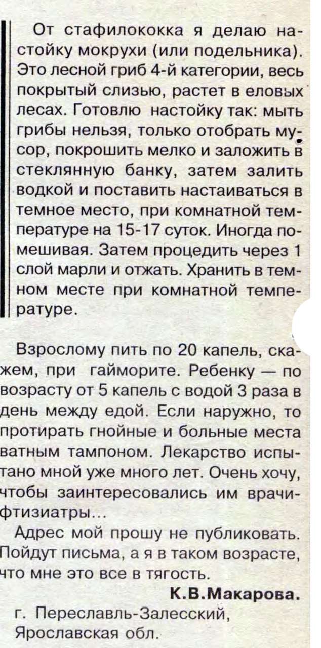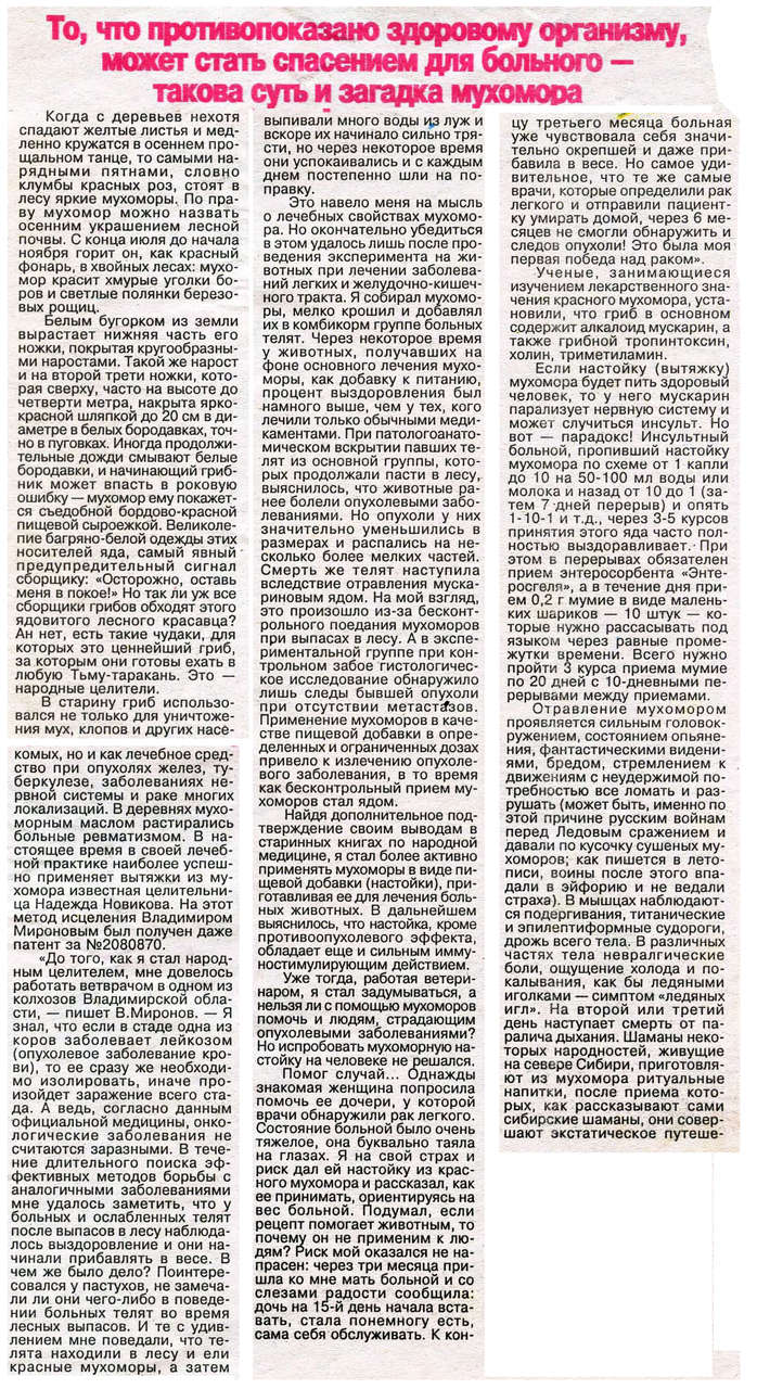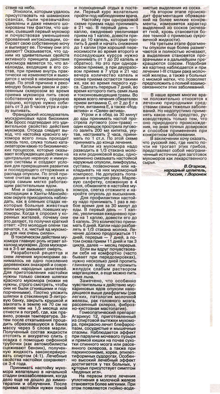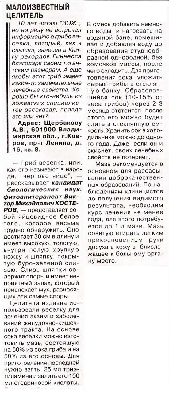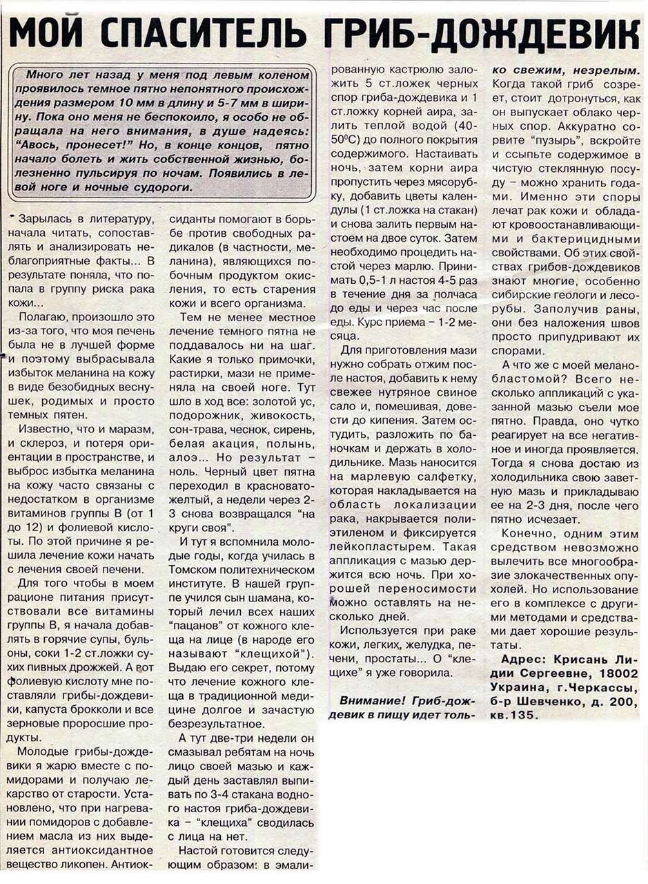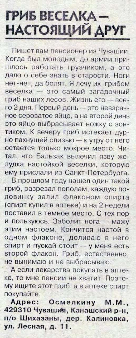Когда прочитала заметку в газете, то еще больше заинтересовалась им. Знала, что он лечит желудок, гастрит, а вот про рак узнала впервые. Видно, он помогает от многих болезней. Когда в нашем доме заболел сосед, то я уже знала, что гриб помогает. Насобирала где-то 6 или 7 грибов, сделала настойку, и соседка поила ею своего мужа. Когда она забирала мужа из больницы, ему определили первую группу инвалидности и сказали, что у него рак легких, а жить ему 2 месяца, не больше. Но сосед выпил две двухлитровых банки настойки гриба, меда и поправился. Аппетит у него нормализовался, он помолодел даже, хотя ему было уже за 60. Прожил еще 2 года после этих микстур, и, может, до сих пор жил бы, но так получилось, что жена прекратила давать ему настойку гриба и начала делать уколы. Вот и результат. Пишу на усмотрение читателей, мне верится, что гриб-веселка помогает от многих страшных болезней.