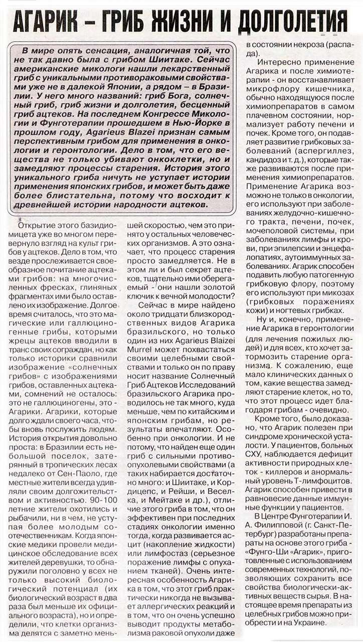 В другой части света — в Бразилии — растёт гриб бразильский агарик. Он очень эффективен как противоопухолевое средство, применяется против болезней кожи, щитовидной железы, диабета и др.