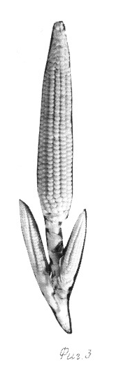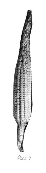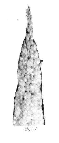 В качестве примера полученных с помощью предлагаемых способа и устройства результатов на фиг. 2-5 приведены новые культуры кукурузы, полученные при облучении ее семян проростком пшеницы. На фиг. 2 приведен пятиствольный кукурузный початок (пятый отросток не виден, расположен за центральным); на фиг. 3 трехствольный початок; на фиг. 4 початок, верхняя часть которого содержит пшеничные зерна; на фиг. 5 увеличенное изображение верхней части другого початка, на котором ясно видны пшеничные зерна, расположенные между кукурузными зернами. Получены и другие интересные результаты. В частности, при облучении томатов биополем картофеля в три раза возросла урожайность по сравнению с контрольными растениями. При облучении томатов физалисом были получены ребристые плоды (напоминающие пирамиду). Облученные лагинарией, кабачком, тыквой, чесноком огурцы имели совершенно другой вкус и запах по сравнению с контрольными. Облученные лагинарией огурцы хранились в свежем виде в течение 6 месяцев. Огурцы, облученные чесноком имели на 2 недели ускоренные сроки вегетации. Удивительный результат получен при облучении гречихи любистоком: гречиха унаследовала от любистока гигантский рост и выросла в виде деревца высотой 2 м.