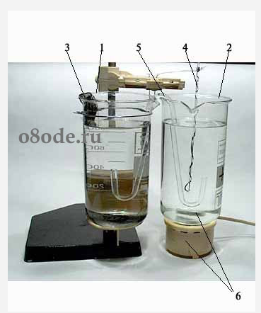 1, 2 – стаканы, стекло; 3 – большой электрод, графитовое волокно; 4 – малый электрод, графитовое волокно; 5 – гидрозатвор, стекло; 6 – магнитная мешалка