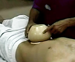 Как правило, болезненное напряжение с живота снимается за счет висцеральной терапии по кругам взаимодействия (работа с ними была описана в предыдущей публикации). После такого обезболивания и расслабления приступают к постановке горшка. В некоторых случаях его заменяют стеклянной банкой. Однако это нежелательно, так как острые края банки при притупленной кожной чувствительности пациента могут травмировать поверхность кожи, надолго оставив след от постановки банки. Поэтому при постановке банки вместо горшка требуется особое внимание со стороны того, кто проводит эту процедуру.