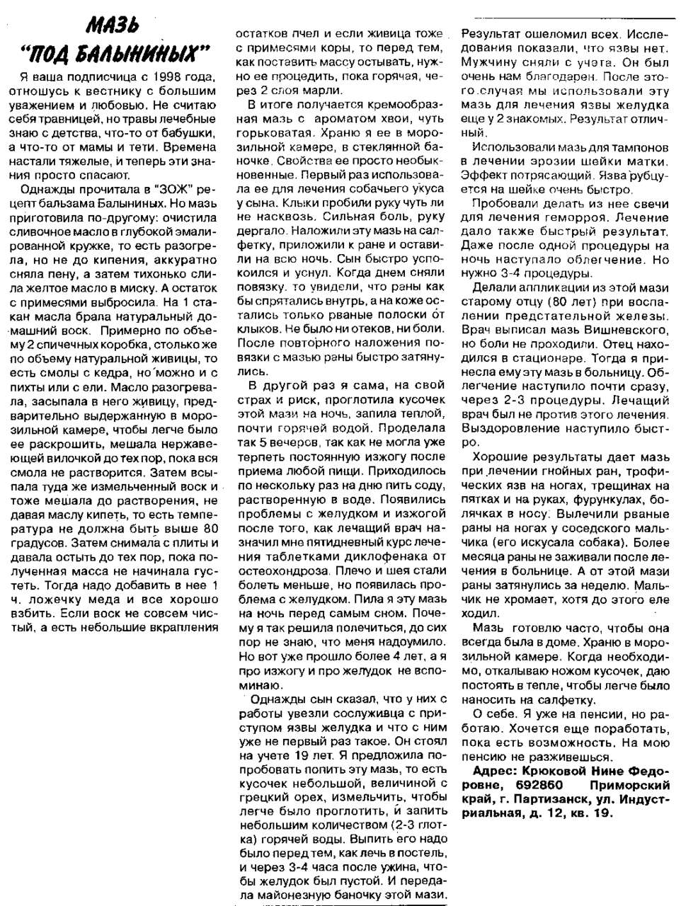 Особая благодарность сестрам Балыниным и Раисе Васильевне Сидоровой из Челябинска, которая сообщила об их фамильном бальзаме. Я сразу поверила в него, приготовила и опробовала не только на себе, но и на членах своей семьи. И вот результат: о ранках, трещинах на коже, насморке даже не говорю -помогает замечательно. Но и в других случаях бальзаму цены нет. У меня на груди появилось что-то вроде герпеса. Боль ужасная. Решила попробовать бальзам. И что вы думаете? Сделала все, как рекомендуют Балынины, наложила повязку - боль утихла почти сразу, а на пятый день герпес мой исчез совершенно. Еще пример. На большом пальце ноги у меня изуродован ноготь, и очень болит сустав. Использовала бальзам. Через сутки ноготь размягчился, и я его аккуратно срезала. Сустав болит теперь значительно меньше, лечение продолжаю.