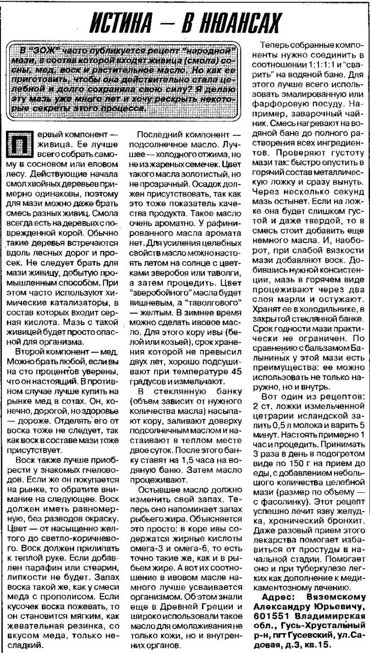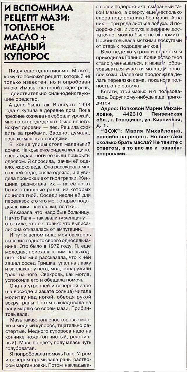 Мазь схожа по своим целебным свойствам с описанным в "ЗОЖ" № 5, (90) составом "Мазь моей бабушки".