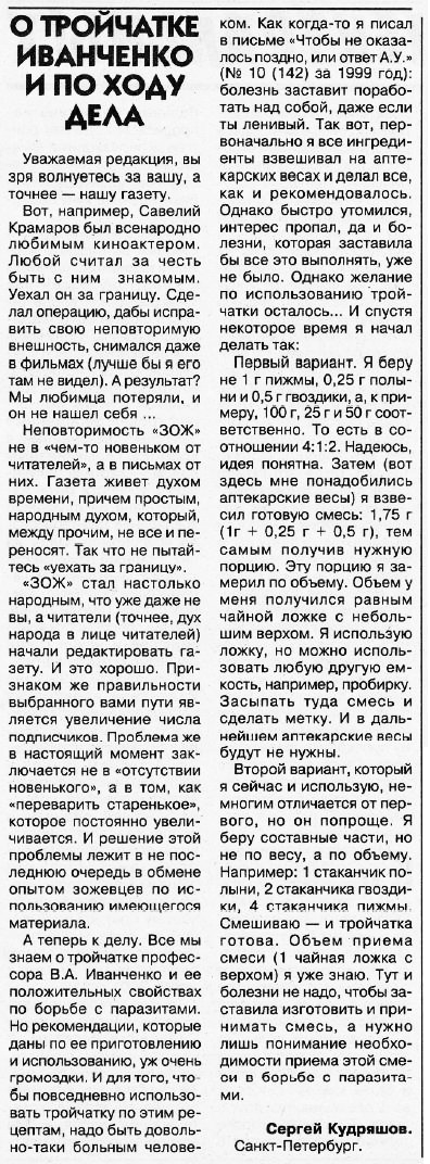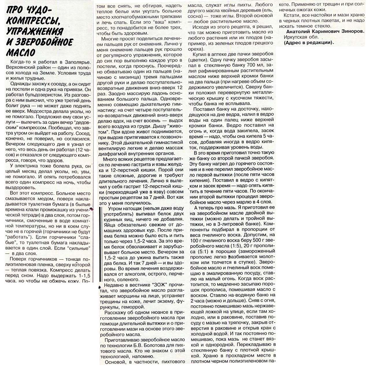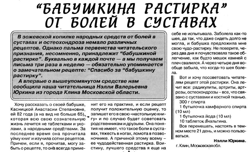 В редакцию «ЗОЖ» нередко обращаются разного рода «умельцы» — обладатели тайн приготовления разных лечебных снадобий - с просьбой опубликовать объявления, мол, вышлите чистый конверт и энную сумму денег, а мы вам - рецепт нашего лекарства. Балынины же бескорыстно обнародовали свое изобретение, чтобы пользоваться могли все, кому необходимо. Ну, а теперь сам рецепт.